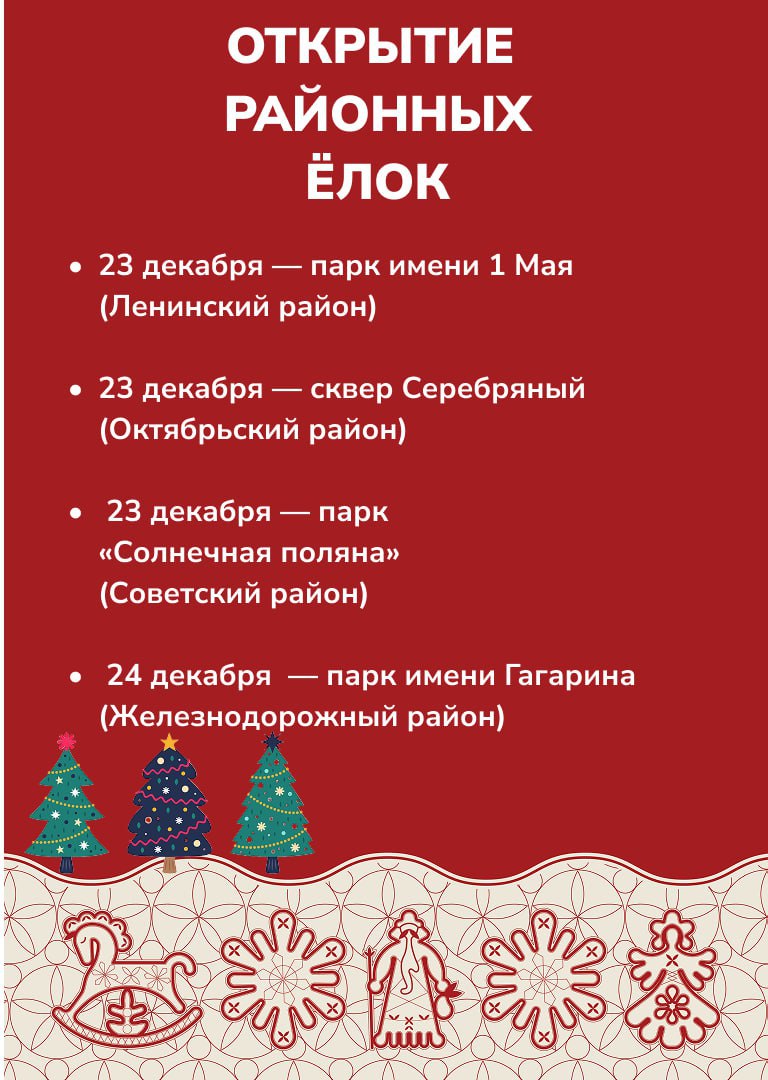 Сегодня, 24 декабря с 18:00 до 20:00 пройдет открытие в Железнодорожном районе в парке им. Гагарина. Центральный район празднует с 19:00 до 21:00 в сквере им. Чернышевского.