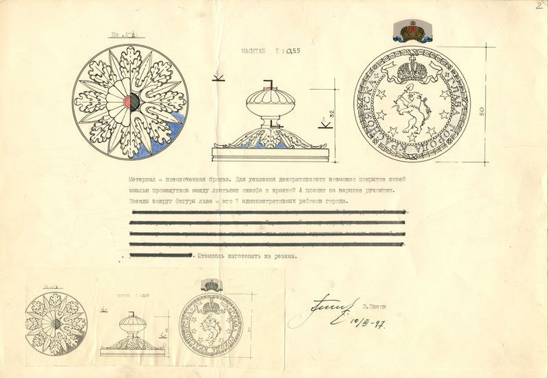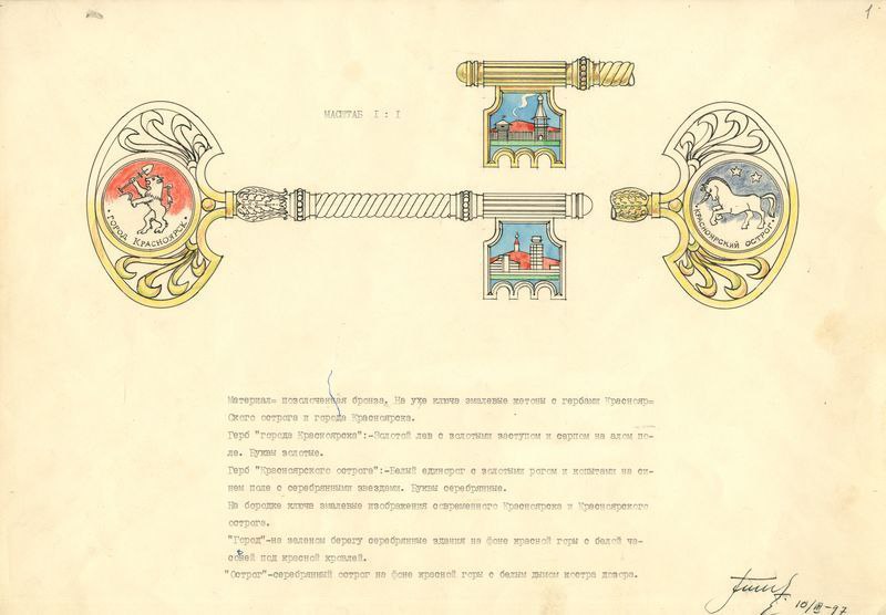 Идея создания символических атрибутов принадлежит почётному гражданину Красноярска, архитектору Эдуарду Панову, который разработал эскизы в 1997 году. Уникальные изделия из золота, серебра и ювелирной эмали по этим эскизам создал уральский художник-ювелир Борис Харитонов.