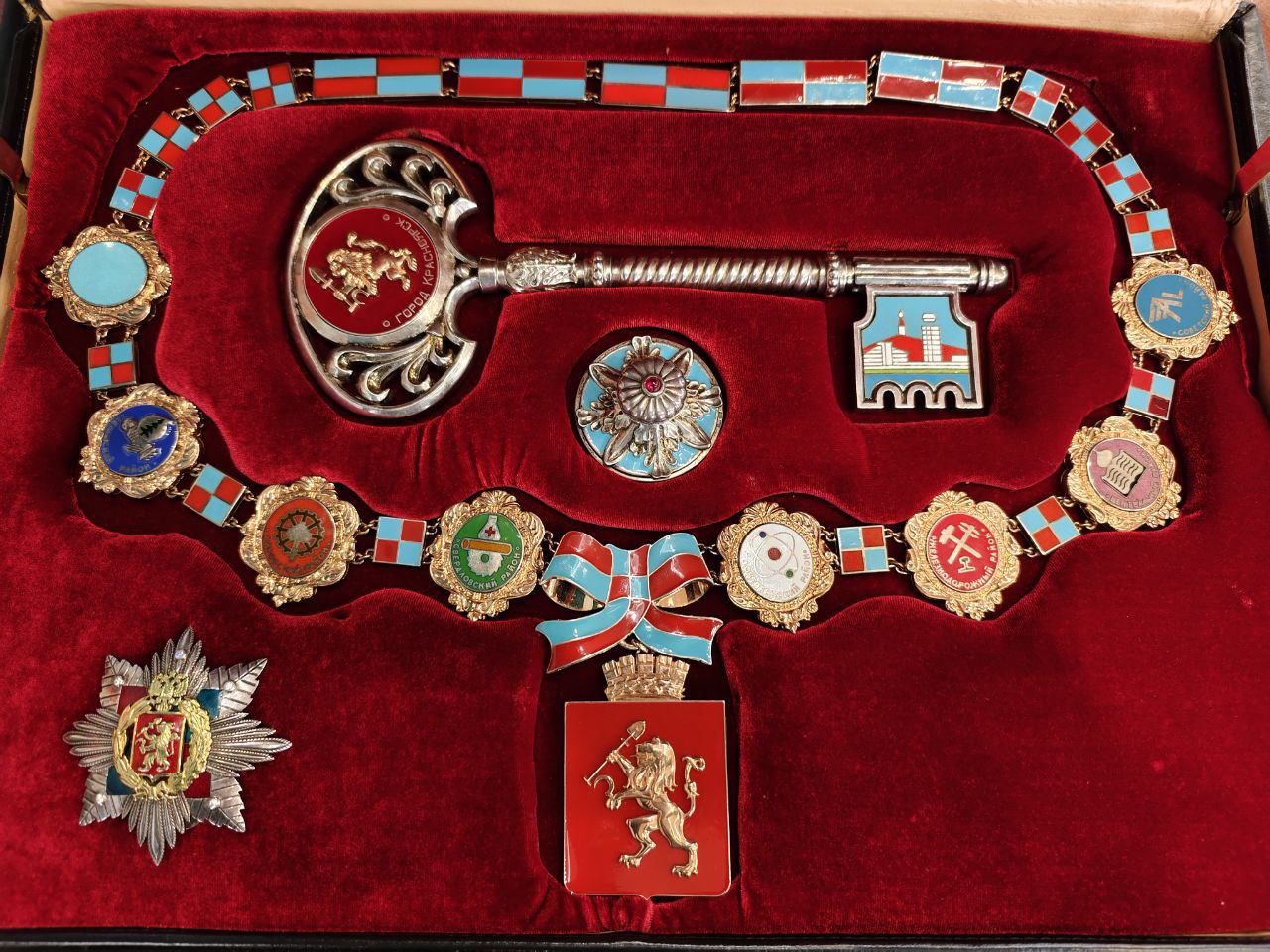 Во время торжественной церемонии вступления в должность избранного мэра Красноярска Сергея Верещагина ему будут вручены атрибуты власти: бармы (геральдическая подвеска), символический ключ от города, нагрудный знак «Звезда мэра» и печать
