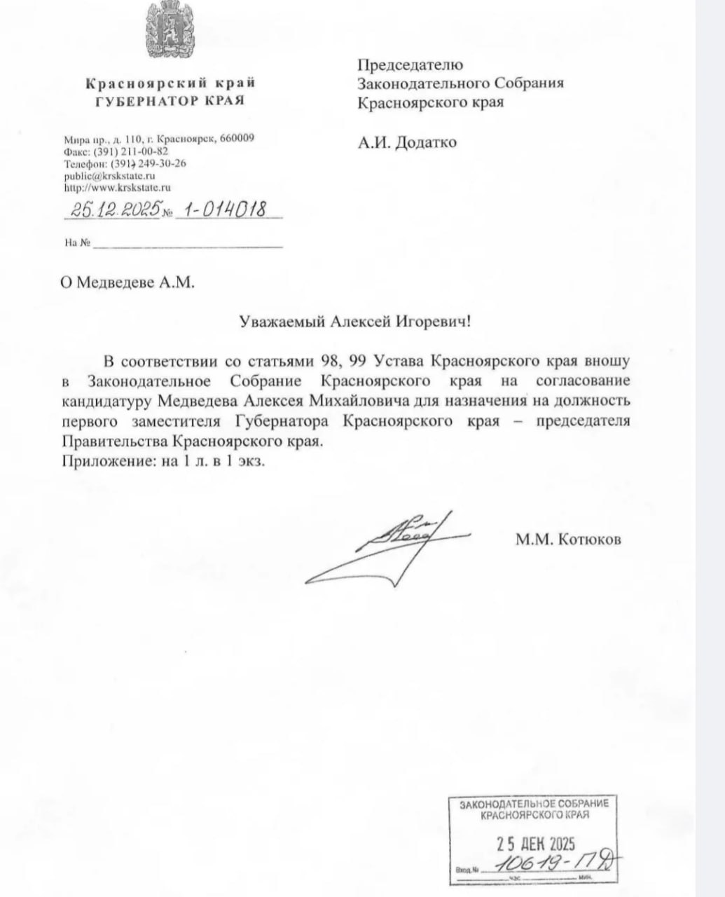 Губернатор Красноярского края Михаил Котюков внёс в Заксобрание кандидатуру председателя правительства Красноярского края - Алексея Медведева