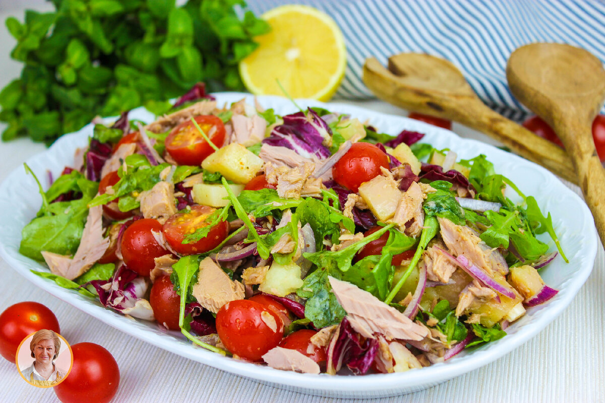 В просторный салатник выкладывают зелень, картофель, лук, кусочки тунца и половинки черри, после чего все щедро поливают приготовленной заправкой. Перед подачей на стол, нужно аккуратно перемешать ингредиенты. Такой яркий и свежий салат с тунцом станет настоящим украшением любого стола, радуя своих гостей и семейство своими безумно вкусными нотами!