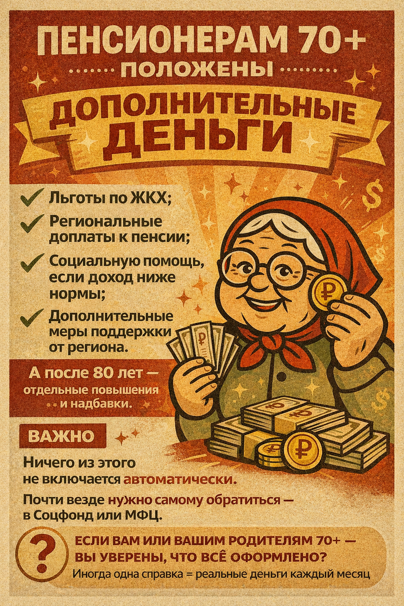 Во многих российских регионах предусмотрены дополнительные выплаты для пенсионеров старше 70 лет. Эти меры поддержки могут включать: