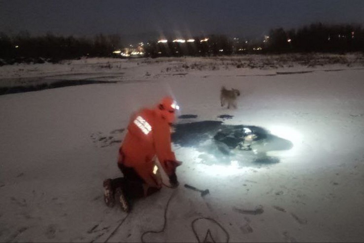 Красноярцы, проходя по улице Дубровинского, заметили, как на льду вокруг пролома бегает собака и жалобно скулит. И позвони по телефону экстренной службы 112. Команда спасателей оперативно прибыла на место.