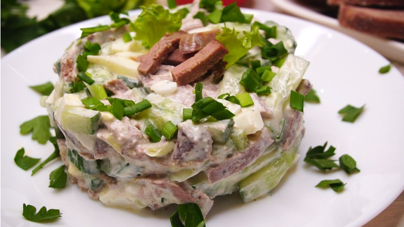 По завершении варки, язык нарезают соломкой, также как и свежий огурец. Яйца стоит нарезать кубиками, а зелень мелко порубить. Все ингредиенты аккуратно складываются в большую миску и заправляются сметаной с горчицей, черным перцем и солью по вкусу. Лимонный сок или йогурт также могут стать отличной заменой сметане, добавляя нотку свежести.