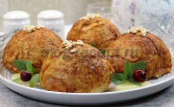 На следующем этапе филе куриного мяса отбивается до тонкого состояния, чтобы удобно обернуть начинку. Подготовленные компоненты укладываются в заранее подготовленные формы, выстланные фольгой, и формируются в округлые шары. Обернуть шары ломтиками ветчины и сыра, после чего завернуть в фольгу. Запекать в духовке при температуре 180 °C в течение 30 минут.