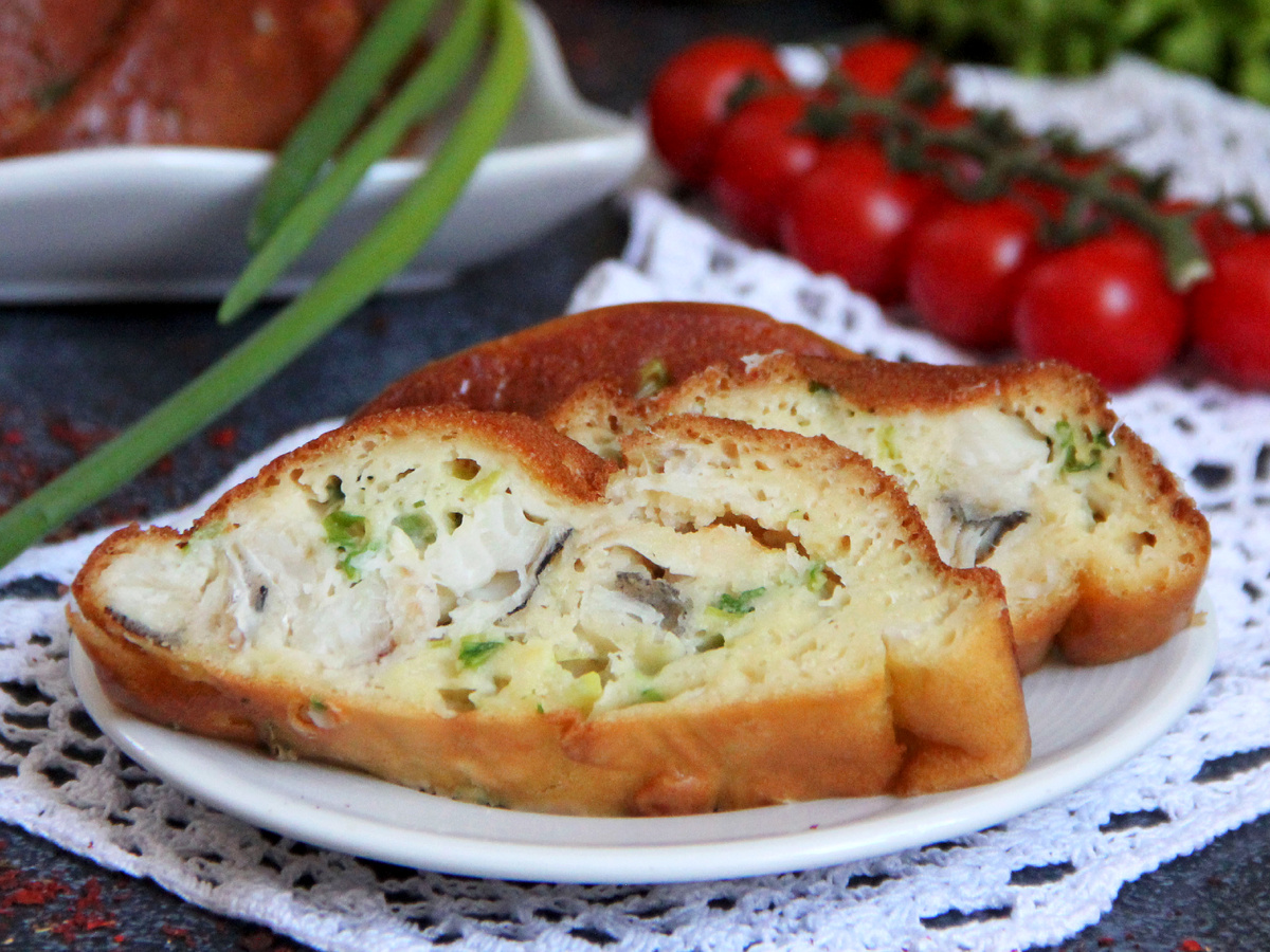 Подготовьте форму диаметром 20 см, смазав ее маслом. Вылейте половину теста на дно формы, добавьте мелко нарезанный зелёный лук (около 30 г), затем распределите обжаренное филе рыбы. Затем покройте оставшейся половиной лука и залейте оставшимся тестом. Установите форму в духовку, предварительно разогретую до 200 градусов, и запекайте в течение 40 минут.