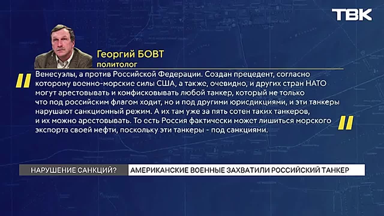 Главная мировая новость последних суток – американские военные захватили российский танкер Marinera. Свои действия власти США называют борьбой с нарушением санкций. По данным СМИ, захваченное судно незаконно перевозило венесуэльскую нефть и еще 2 недели назад ходило под флагом Панамы и другим именем.