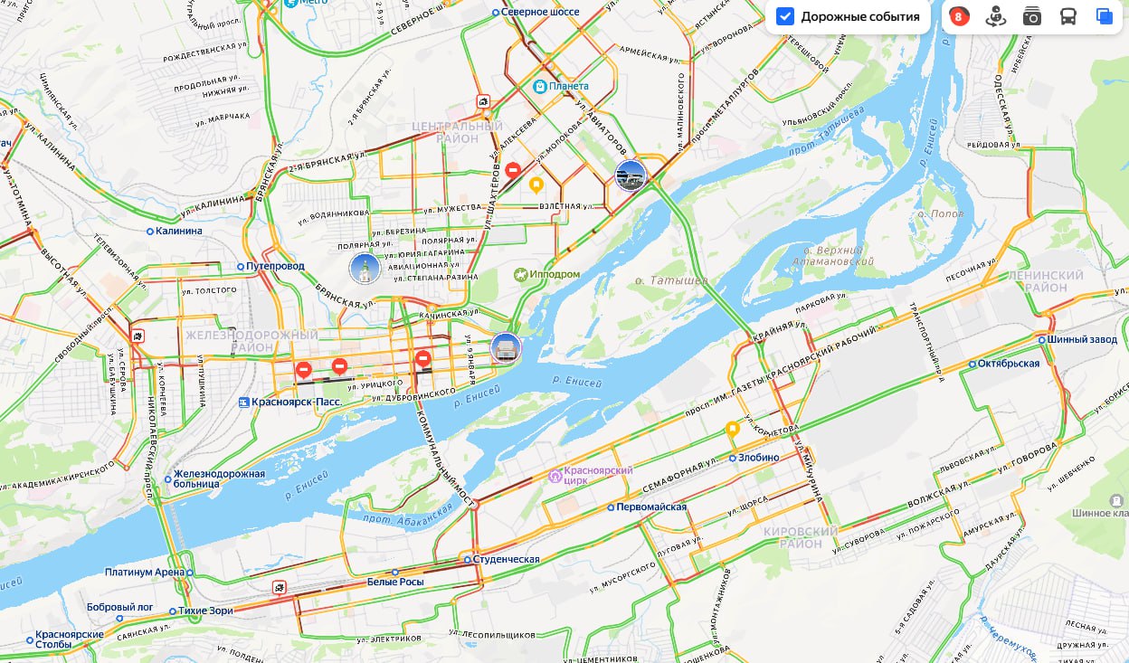 «Стоят» Свердловская и Красноярский рабочий, Коммунальный мост в сторону центра и Ярыгинский проезд, а также Брянская, Маерчака, Шахтеров, Партизана Железняка и Авиаторов.
