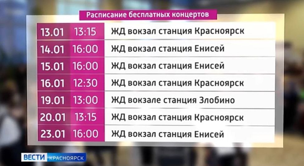 Перед горожанами и гостями краевой столицы выступят известные коллективы. Красноярский камерный хор представит новогоднюю программу 14 января в 16:00 на вокзале станции Енисей. Там же выступит Ансамбль народной песни «Красный Яр». Также можно будет послушать оркестр Красноярского музыкального театра и Красноярский духовой оркестр. Завершатся концерты на вокзале — 23 января.
