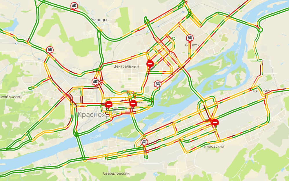 Сложно проехать по Брянской, Шахтеров, Свободному, Маерчака, Высотной, Калинина, Партизана Железняка, Молокова, Семафорной, Красрабу, 60 лет Октября и другим улицам. В городе много аварий.Скрин: Дубль Гис@eniseytv