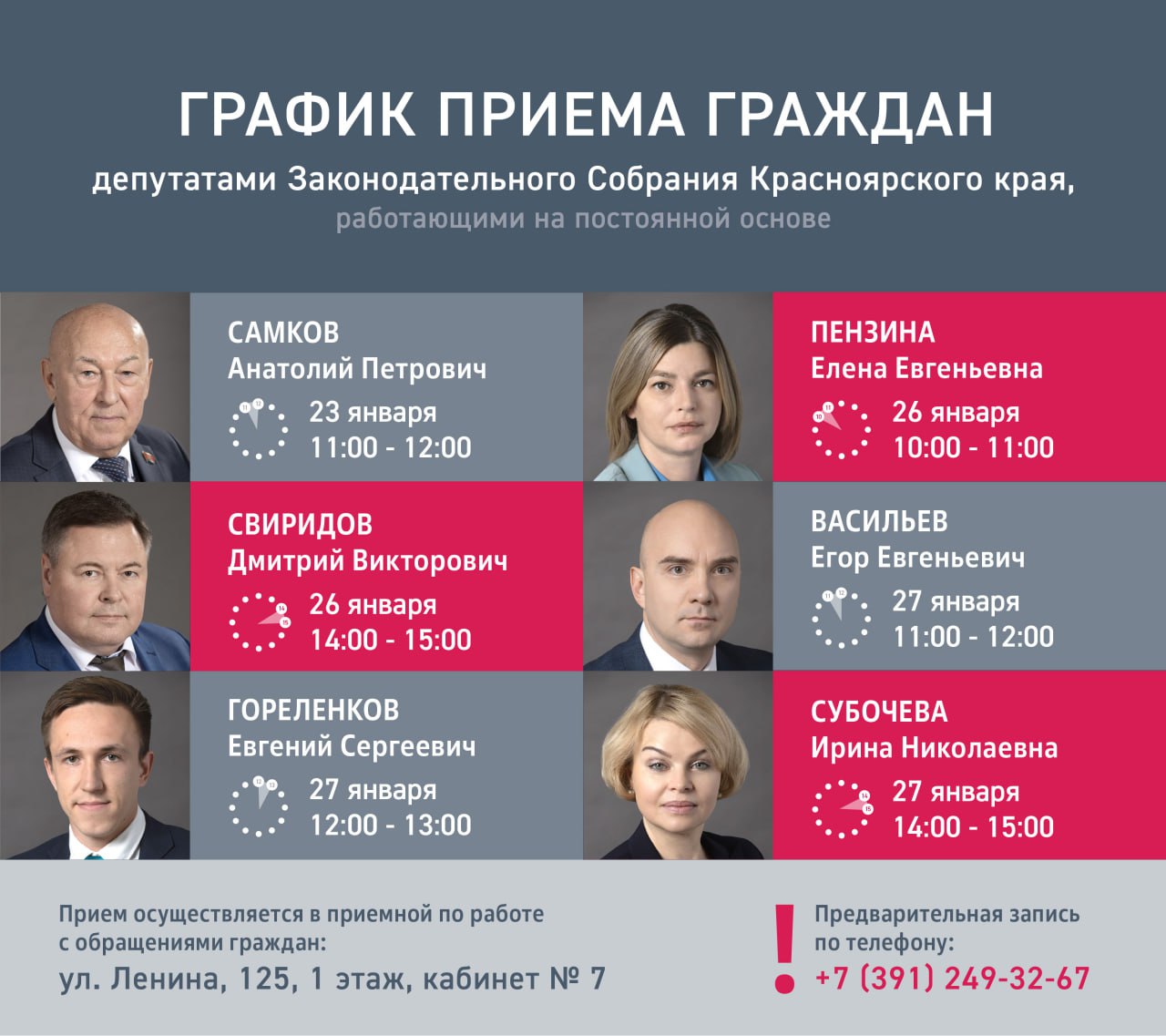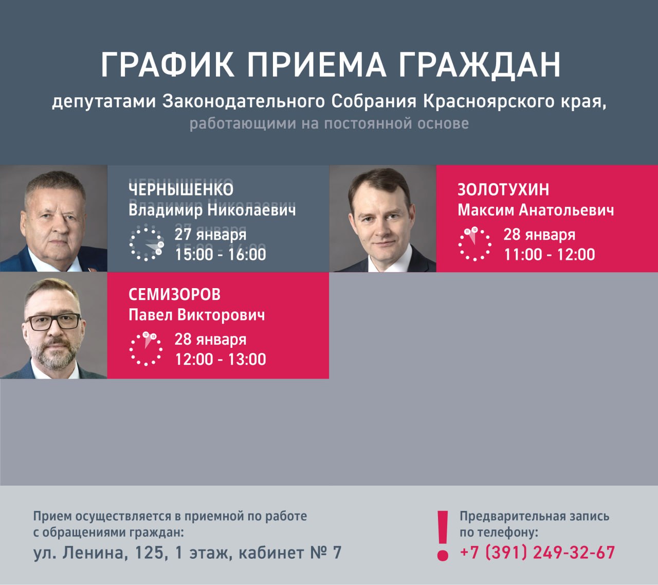 Прием осуществляется в приемной по работе с обращениями граждан: ул. Ленина, 125, 1 этаж, кабинет № 7.
