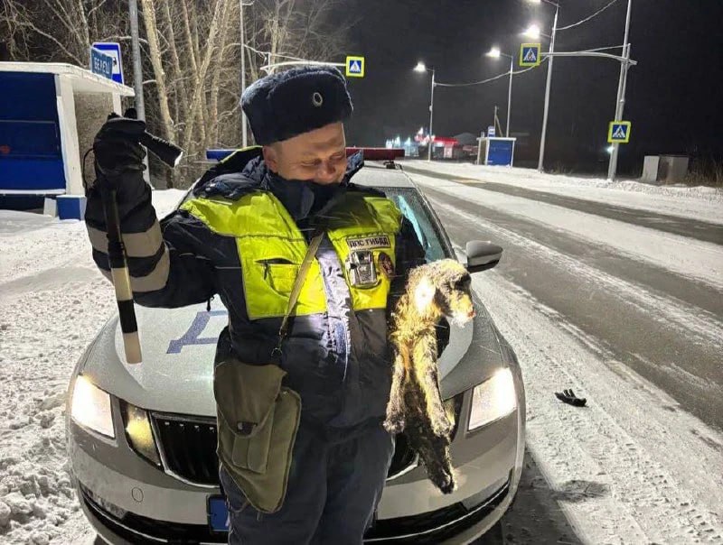 Инспекторы заметили замерзающее животное на трассе. Хозяина поблизости не было. Малыша отогрели в служебном авто и начали искать владельца.