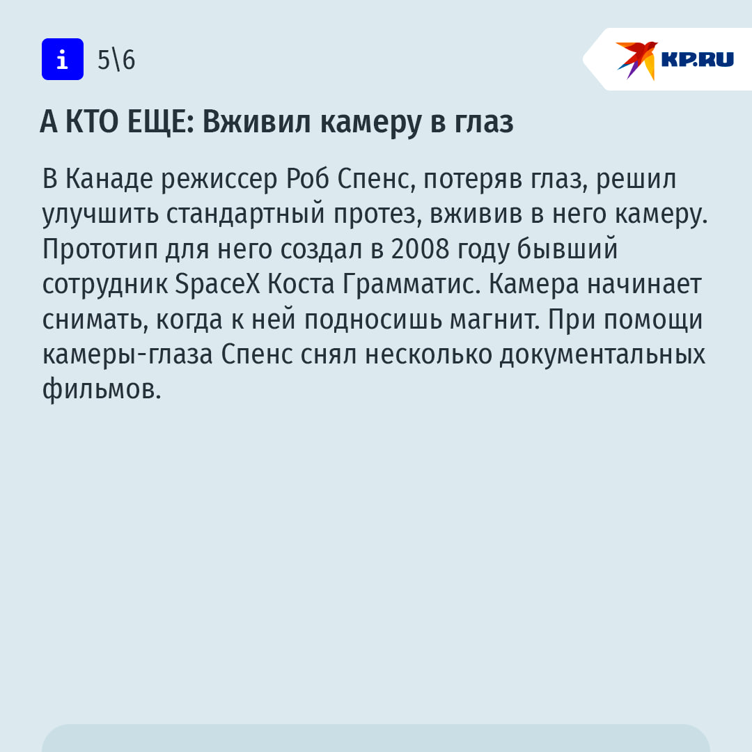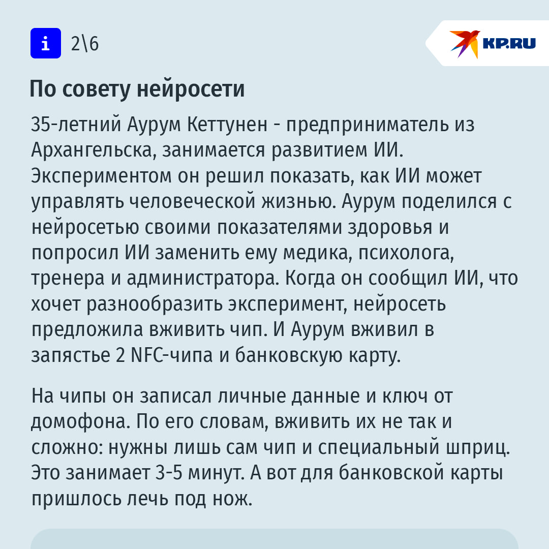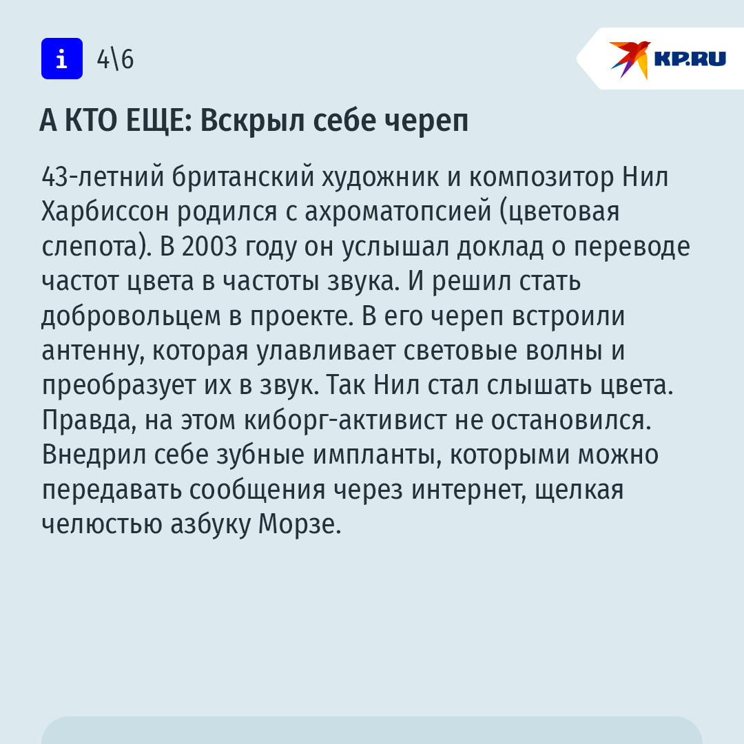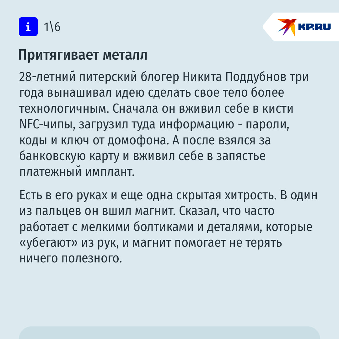 Помните инспектора Гаджета из мультсериала? Электронный полицейский был нашпигован огромным количеством технических приспособлений для борьбы с преступниками. В 2015 - 2018 годах этот персонаж казался выдумкой. Но спустя 10 лет мультфильм уже не смотрится фантастикой. Люди реально вживляют в свое тело различные чипы. "КП" решила узнать у современных российских "киборгов", как и зачем они меняют свое тело с помощью технологий. Подробнее – в наших карточках