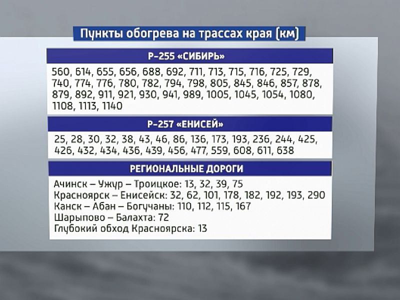 Они находятся при заведениях общепита и гостиницах. Укрыться от мороза можно на трассе Р-255 «Сибирь» через каждые 30–50 километров, а на Р-257 «Енисей» практически через каждые 10 километров. Также на региональных магистралях находятся и пункты оказания экстренной медицинской помощи.