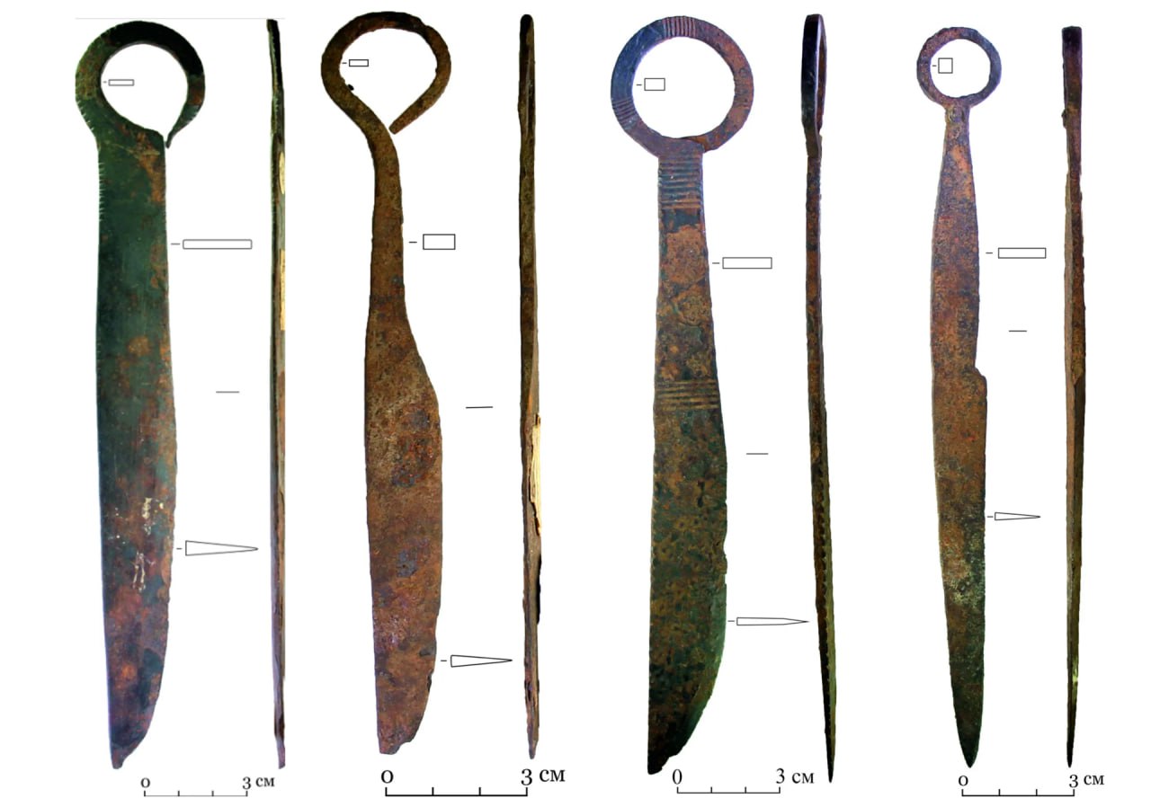 — Археологические экспедиции — это не всегда поездки в тайгу, горы и болота. Иногда, чтобы найти хорошие материалы, нужно ездить по малым региональным музеям и тщательно разбирать старые коллекции. Как раз по результатам такой работы смогли собрать, систематизировать и опубликовать коллекцию железных ножей из 17 предметов. На большей части из них сохранились следы воздействия огня (окалина), это позволяет предположить, что ножи происходят из уже разрушенных погребений, — отметила старший научный сотрудник лаборатории археологии Енисейской Сибири Полина Сенторусова.