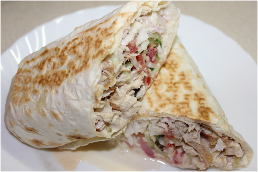 4. Сборка шаурмы. На лаваш намазать соус и уложить слои из капусты, курицы и овощного салата. Завернуть рулет, аккуратно подгибая края.