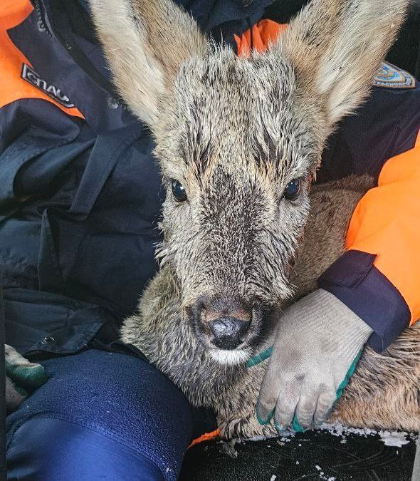 Животное заметили в кустах на одной из улиц города. Молодая косуля была настолько слаба, что даже не могла подняться на ноги. Спасатели аккуратно достали её и отвезли к ветеринарам.