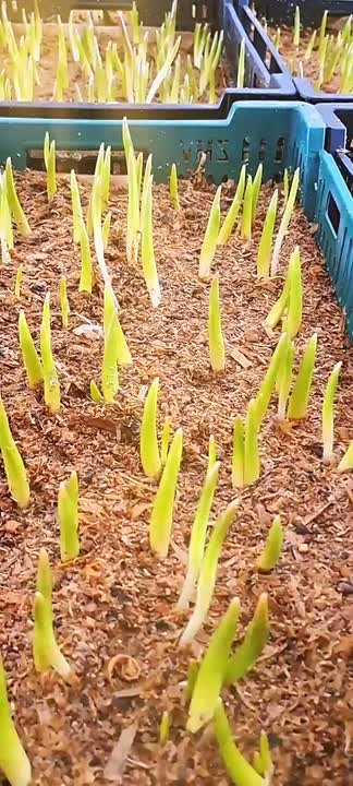 Пока стебли имеют светло-зелёный оттенок, но под действием света окраска постепенно изменится на ярко-зелёную. Сейчас агрономы помогают тюльпанам адаптироваться к новой обстановке: регулярно поливают их, вносят удобрения и внимательно следят за состоянием растений.