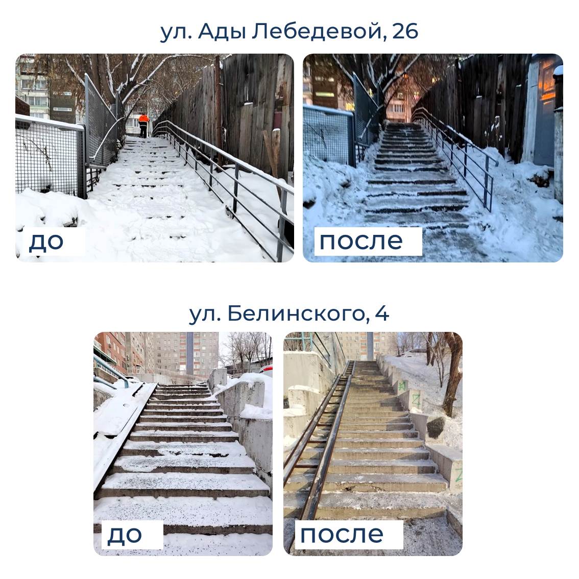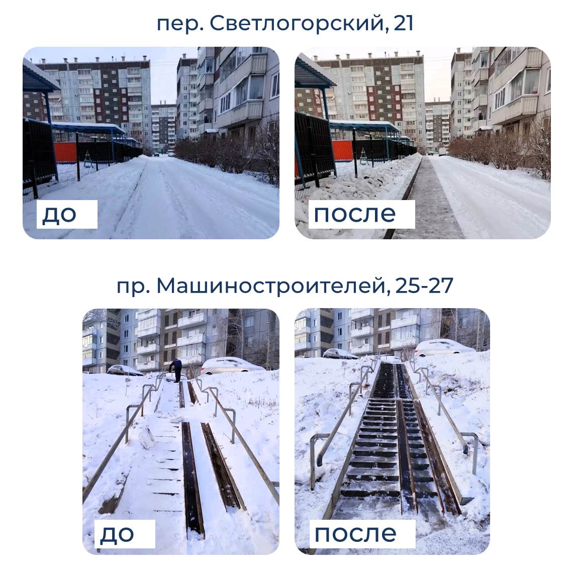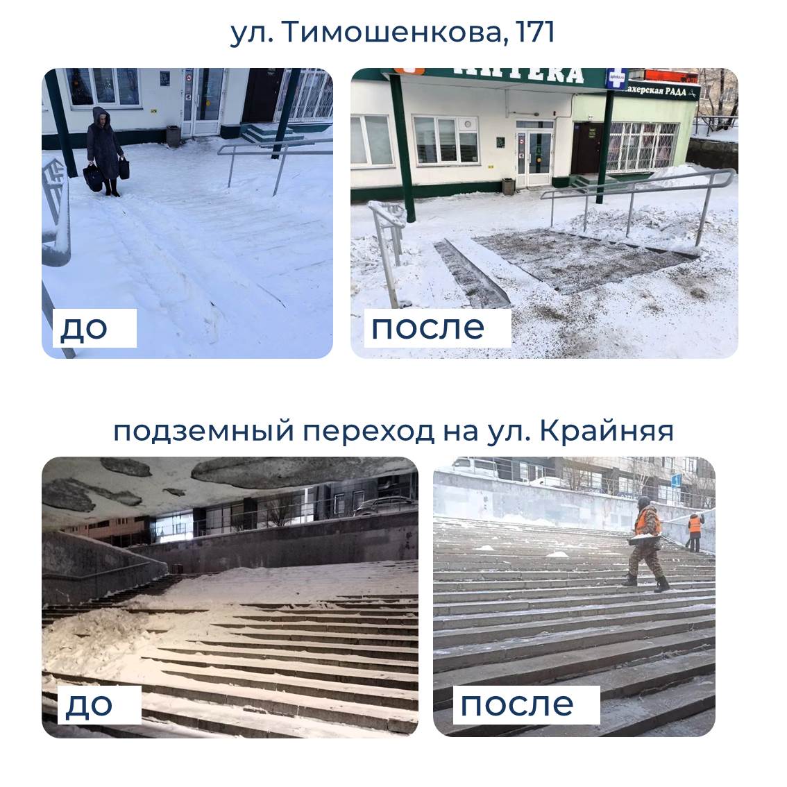 Очистили лестницы от снега и наледи на ул. Шевченко, 8, пр. Машиностроителей, 25–27, а также подземный переход на ул. Крайняя.
