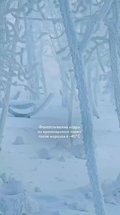 На кадрах — заледенелые ели, скамейки, мосты, а люди пробираются сквозь туман. Столбики термометра показывают -40 градусов.