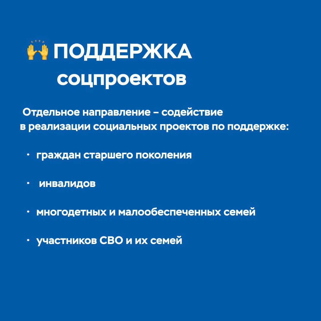 социальных проектов по поддержке граждан старшего поколения, инвалидов, многодетных и малообеспеченных семей, участников СВО и их семей.