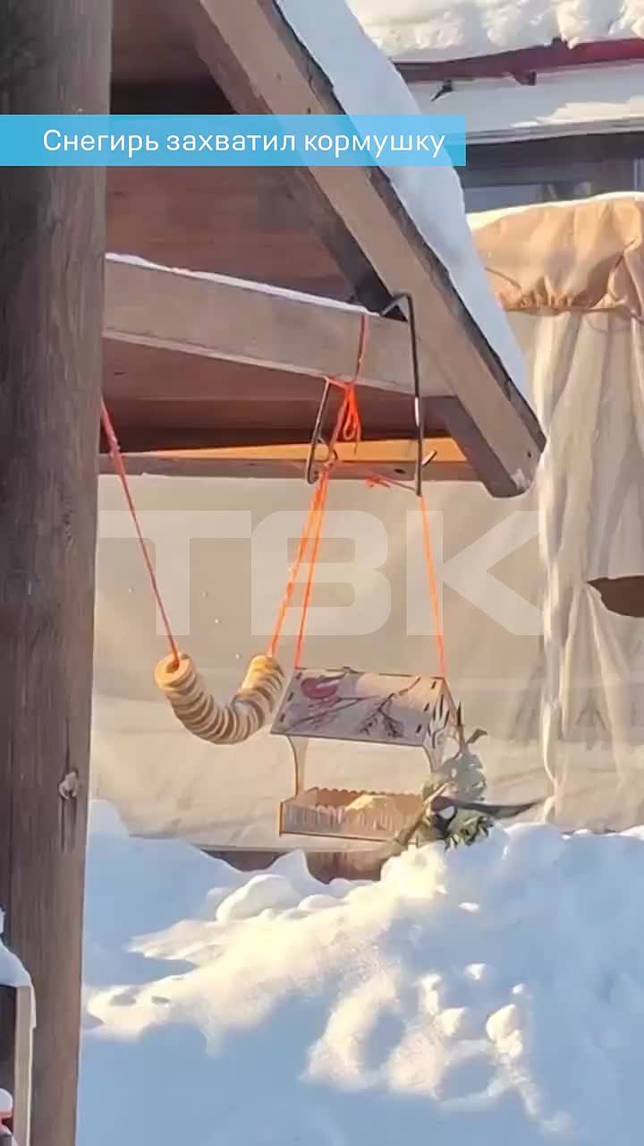 Снегирь захватил кормушку и не пускает туда остальных птичек. Смотреть без СМС и регистрации.