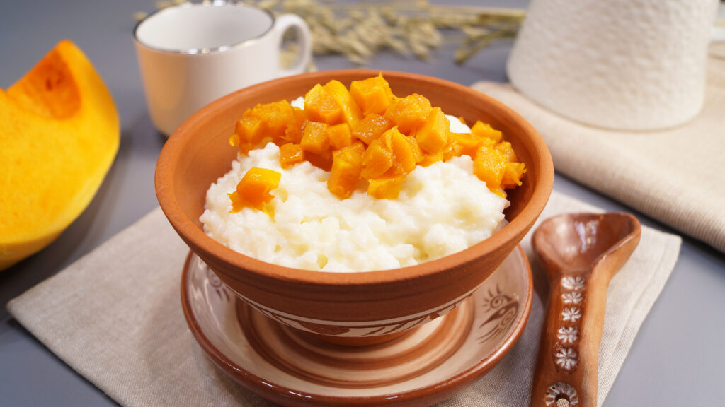 Плюс собственного вкуса — карамелизированная тыква или яблоки. Тыква нарезается кубиками и обжаривается с маслом и небольшим сахаром до янтарности, яблоки — аналогично, быстро за счёт быстрого карамелизирования. В результате сладость идёт отдельной нотой к рисовой основе.