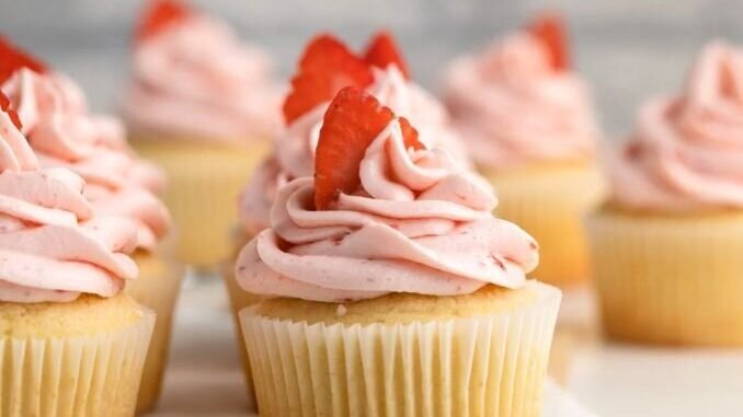 Новый рецепт обещает получить идеальные ванильные капкейки: лёгкие, влажные и с плотной, но воздушной текстурой. Главный секрет — обычный густой йогурт, который делает тесто особенно мягким без использования молока или пахты. В качестве финала — яркая масляная глазурь с концентрированным клубничным пюре.