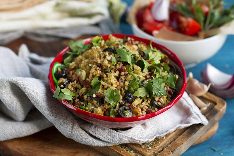 Шаг 5: В сковороду добавьте варёный булгур, специи гарам масала и кешью. Обжаривайте всё вместе ещё 1-2 минуты. Мелко нарезанную петрушку добавьте в сковороду и перемешайте. Подавайте блюдо вместе с овощным салатом.