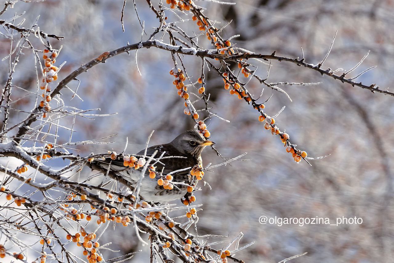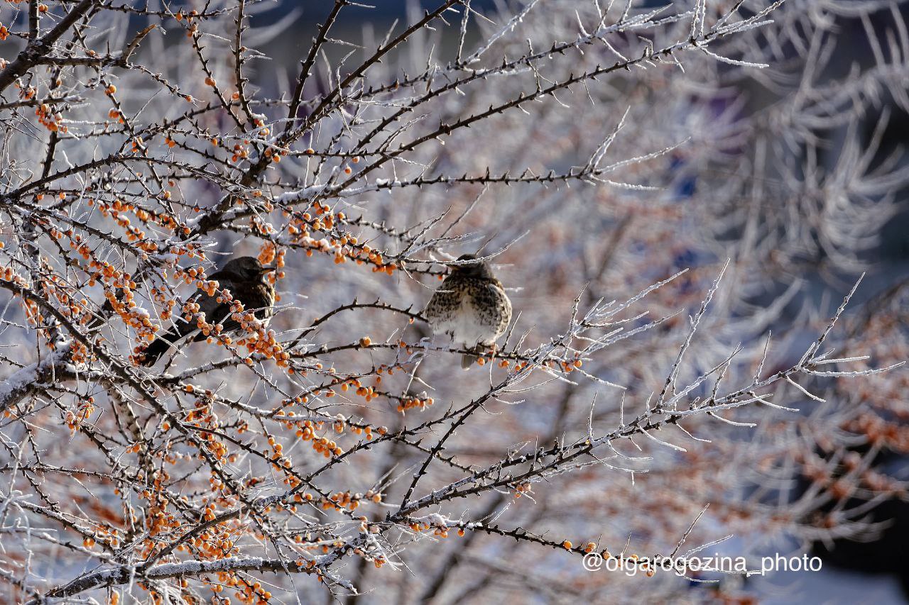 Красивые и пушистые снегири, а также их знакомые дрозды.Через пару дней кусты опустели: ни ягоды, ни птиц.