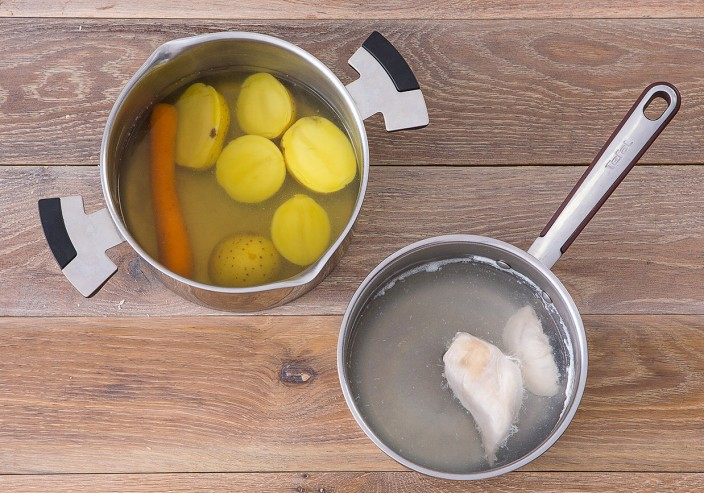 Шаг 1: Начните с картофеля: тщательно промойте, разрежьте пополам и отварите вместе с морковью в кипящей воде в течение 15 минут. Отдельно приготовьте курицу – варите её около 8 минут.