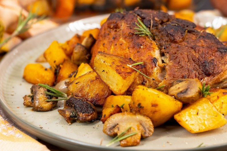 8. Подача. Готовую свинину нарежьте на порции и подавайте с овощами, украсив блюдо свежим розмарином.