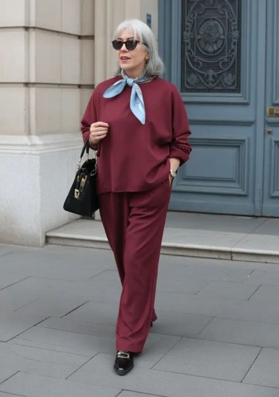 - Практичный и комфортный наряд. Основа образа – трикотажный костюм бордового цвета с свободными брюками и джемпером. Его легко дополнить черными аксессуарами, такими как сумка с короткими ручками, туфли на плоском ходу и стильные очки. Для яркости можно добавить голубой платок с легким принтом на шею.