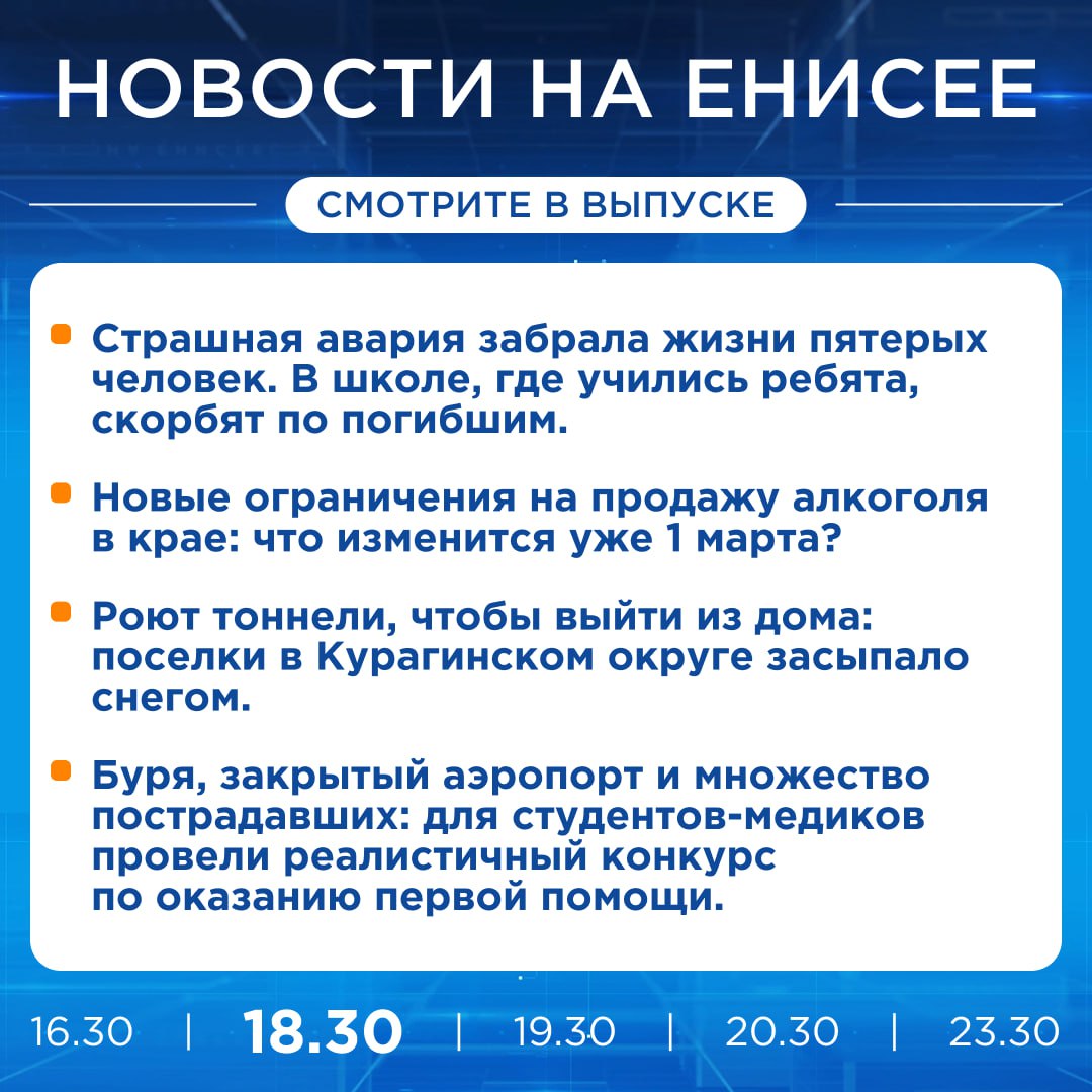 Вести-дайджест03.02.2026Нападение в школе. 14-летняя школьница ранила ножом сверстницу в КодинскеРоковая поездка. Задержан водитель грузовика, ставший виновником смертельной аварии в Рыбинском округе Временные рамки. С 1 марта в Красноярском...