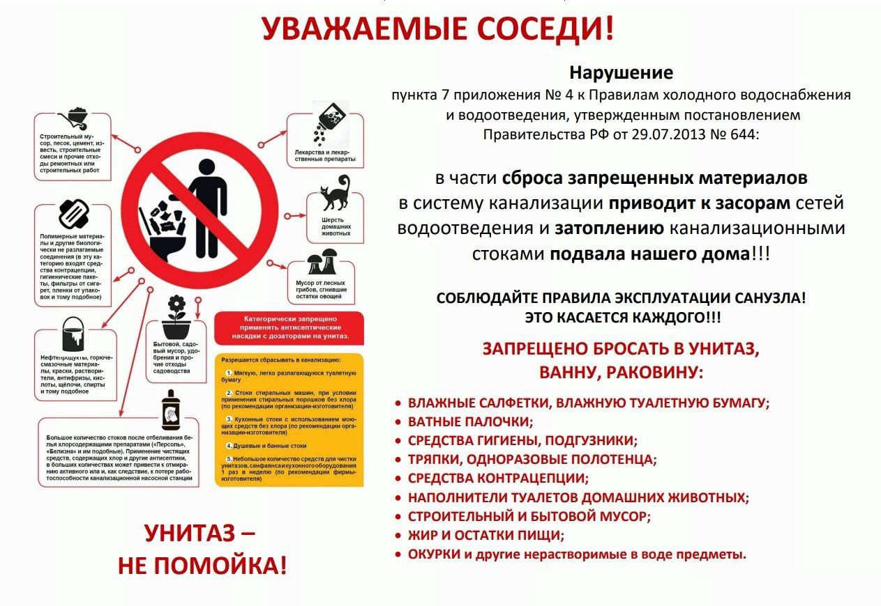 Неправильное использование внутридомовых систем канализации неизбежно ведёт к засорам в том числе уличных сетей водоотведения и выходу сточной воды на дворовую территорию или проезжую часть.
