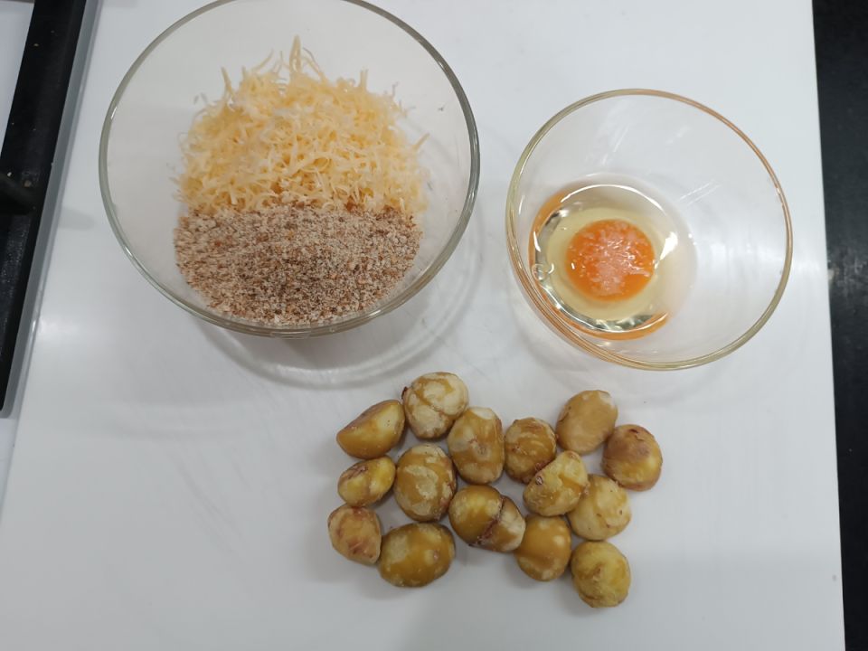 Натертый на мелкой терке сыр перемешивается с панировочными сухарями. В отдельной миске яйцо взбивается с щепоткой соли. Подготовленные каштаны поочередно окунаются в яйцо, а затем щедро обсыпаются сырно-сухарной смесью, слегка прижимая ее к ореху. Для удобства можно использовать деревянные зубочистки.