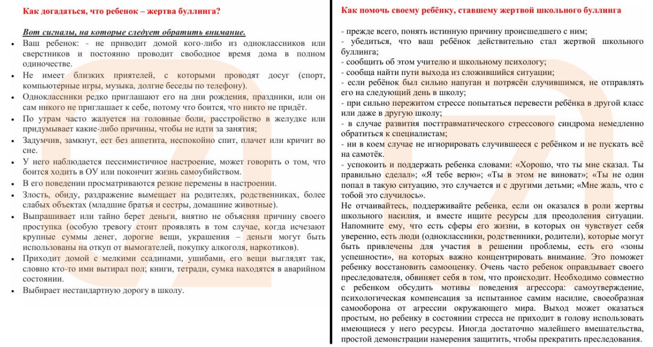 Об этом рассказал источник «7 канал Красноярск». В памятках рекомендуют обращать внимание на сигналы, что ребенок стал жертвой. Входят в этот список признаки от отсутствия контакта со сверстниками до прямых разговоров о самоубийстве.