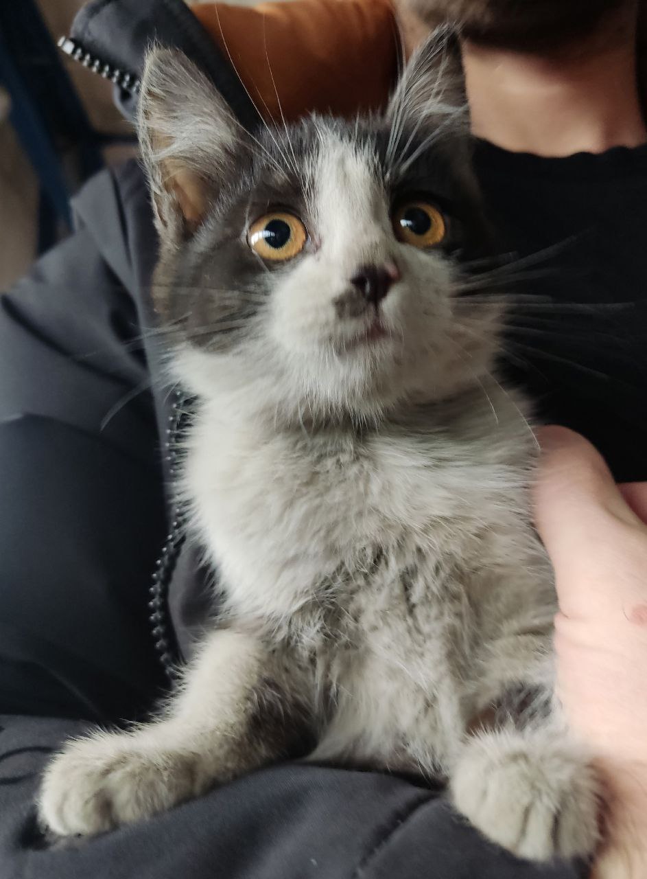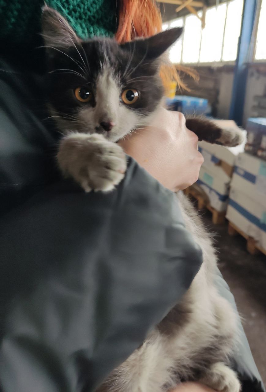 «Кошечка, 3 месяца, на складе на ул. Пограничников. Шустрая, ручки знает, ящик с опилками под туалет стоит. Родилась от приблудившейся кошки (кошку стерилизовали). Очень не хочется, чтобы она пополнила армию бездомышей в промзоне.Не место ей на складе. Помогите репостами малышке».
