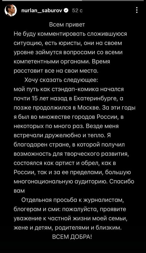 Нурлан Сабуров в соцсетях написал, что благодарен России, и вспомнил, как тепло его встречала публика в регионах и как 15 лет назад в Екатеринбурге началась его карьера.