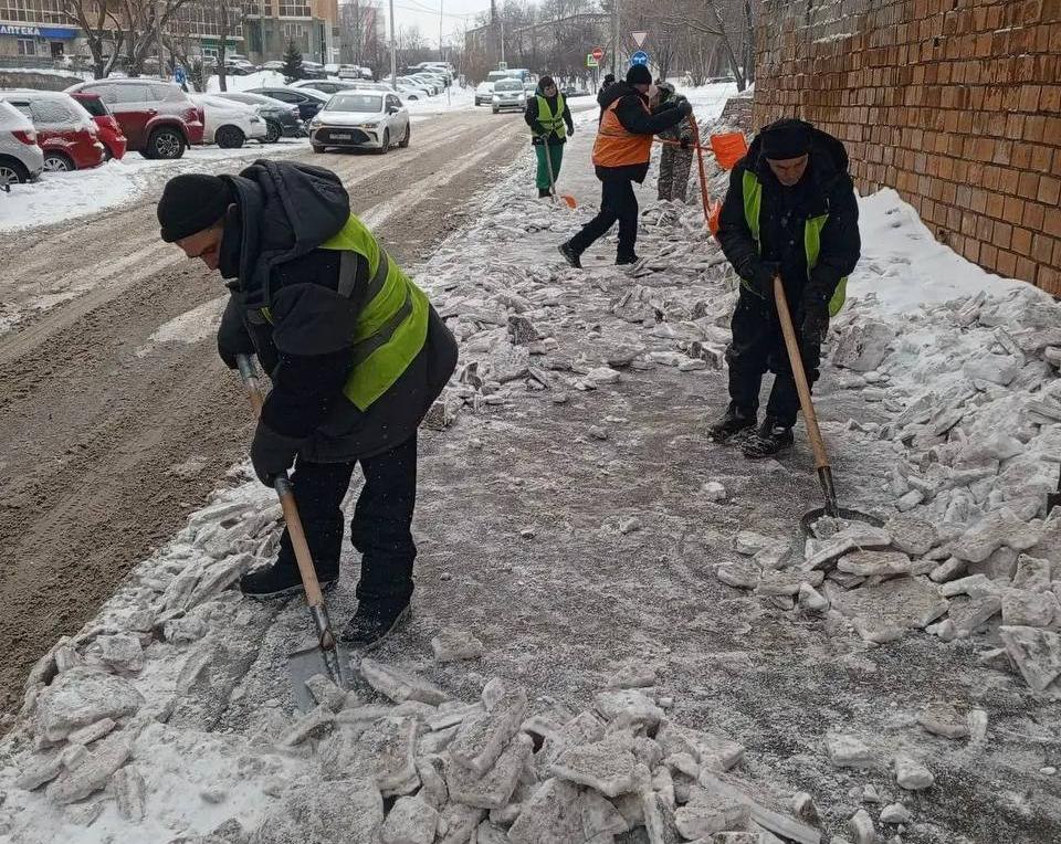 Тёплая погода позволила расчистить тротуары до асфальта. Рабочие убирали снег и наледь на проспекте Свободном, улицах Алеши Тимошенкова, Ладо Кецховели, Тотмина, Щорса, Норильской, Свердловской, Дзержинского, Авиаторов, Молокова и других.
