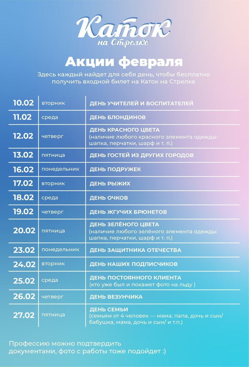 Весь февраль акции проходят на катке на Стрелке. Смотрите в табличку и ищите что подходит вам.