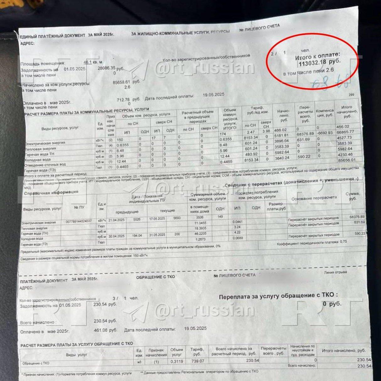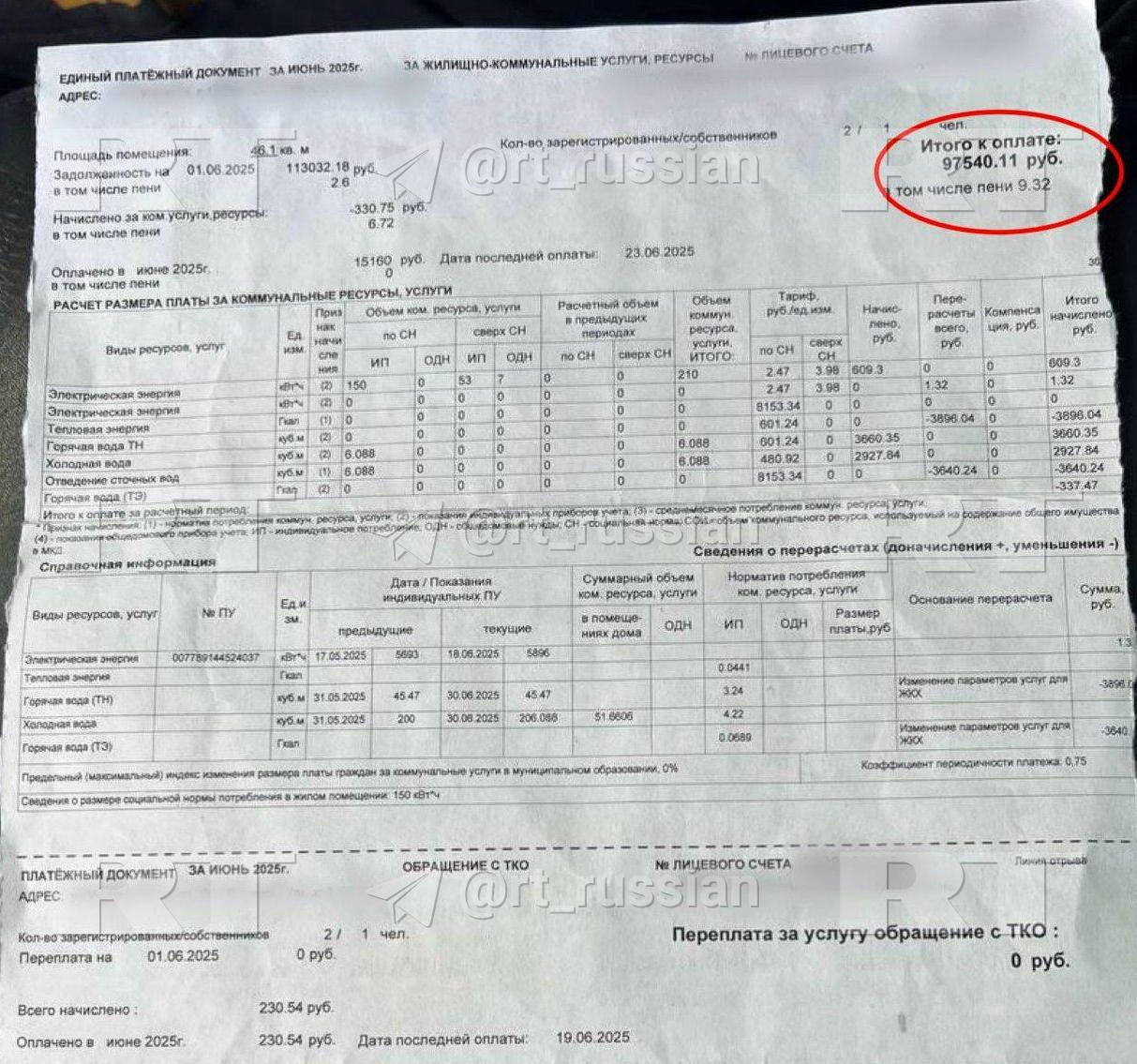 рублей: жители села Бражного в Красноярском крае прислали RT фото квитанций за коммуналку, которые получили в мае и июне 2025-го.Подписаться на RT: ТГ | Зеркало | MAX