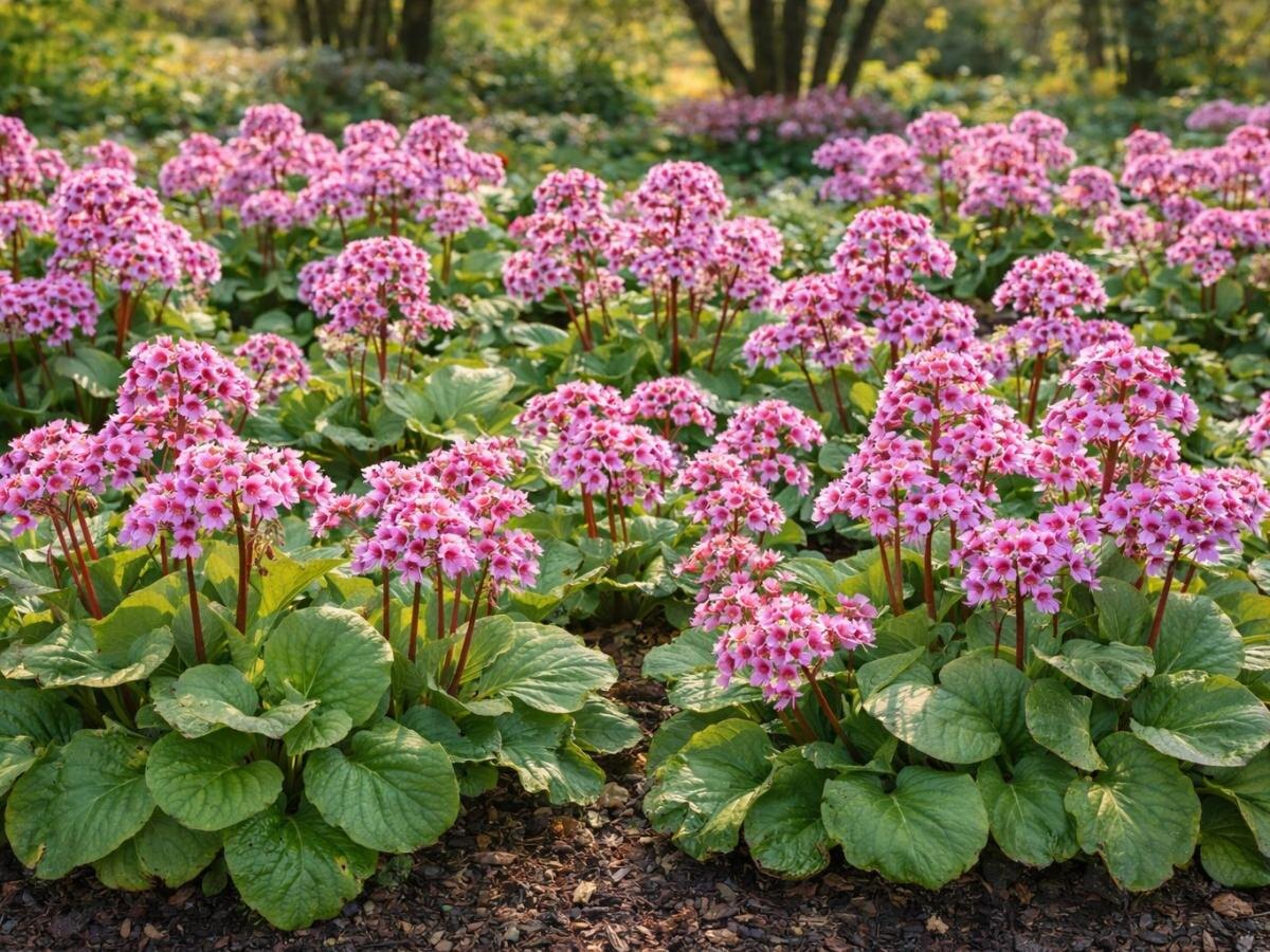 Это растение прекрасно чувствует себя в условиях полутени и под кронами деревьев, образуя густые группы с крупными, кожистыми листьями. Благодаря своей устойчивости бадан становится идеальным выбором для сложных микроклиматов, где другие растения могут не прижиться. Это делает его отличным партнером для тенистых зон сада, где важно создать стабильность без лишних хлопот.