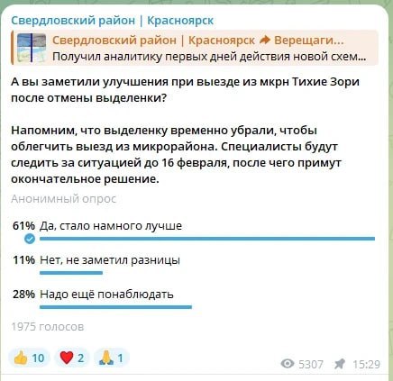 Но власти решили опираться не только на цифры. Каждый третий участник опроса в телеграм-канале Свердловского района считает, что делать выводы пока рано. Специалисты вместе с ГИБДД продолжат наблюдение. Итоги пообещали представить уже в конце недели – после этого примут окончательное решение.
