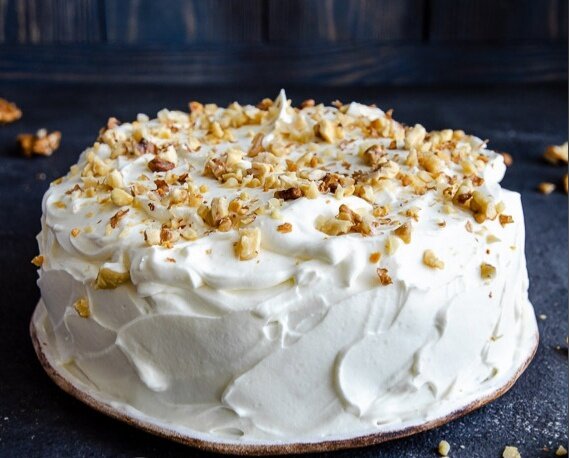- Приготовьте крем! Взбейте сметану и сливки с сахарной пудрой. Нанесите его на остывший пирог. Не забудьте украсить оставшимися орехами!