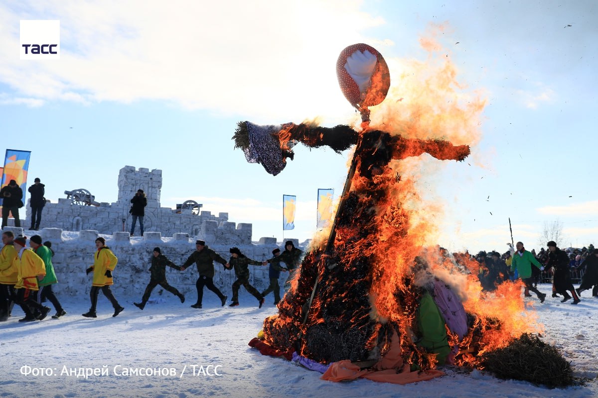 Сожжение праздничного чучела, символизирующего уходящую зиму, во время масленичных гуляний в селе Сухобузимское.