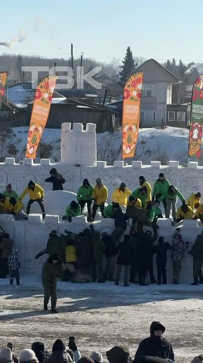 На Масленице в Сухобузимском селе устроили театрализованное представление. На ролике — команда спортсменов защищает крепость, а команда казаков — бросается в атаку.