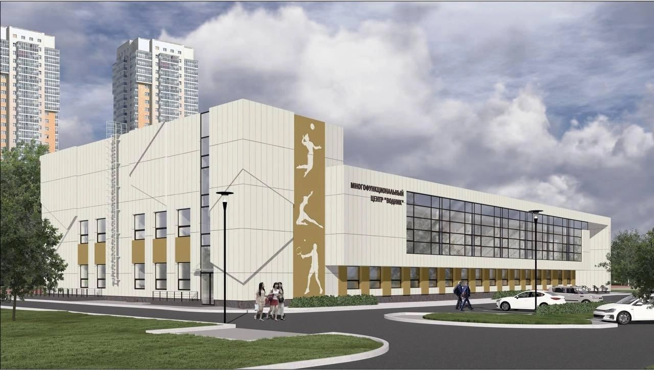 Фасад спорткомплекса выполнят в светло-серых и золотистых тонах. Предусмотрена вечерняя подсветка.