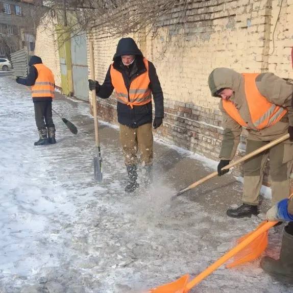 Дорожники в городе вручную скалывают лёд с тротуаров