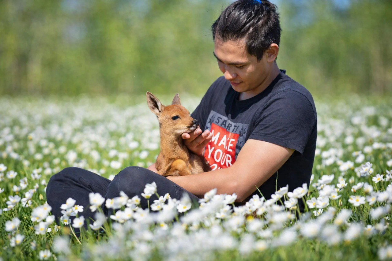 Только высадились, слышат – кто-то пищит. Пошли на звук, он шел из густой травы. Развели ее руками, ахнули: перед ними был крошечный косуленок. Позвали тихо-тихо, чтобы не напугать: «Малыш, иди к нам! Кто тут такой хорооооший?»